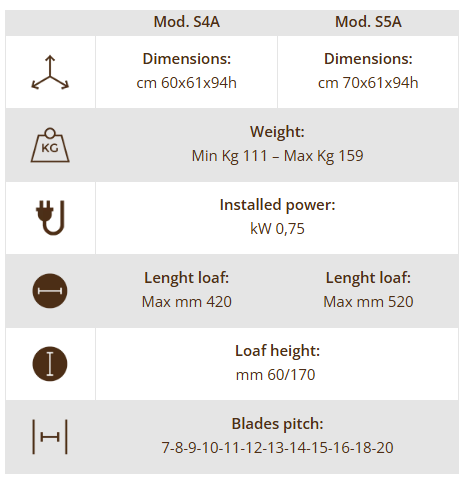 Sibread S4A / S5A je automatický kráječ chleba určený pro pekárny, prodejny pečiva a gastronomické provozy, kde je potřeba rychlé a přesné krájení bochníků chleba na rovnoměrné plátky. Zařízení je vhodné pro pšeničné, žitné i vícezrnné chleby a umožňuje efektivní krájení většího množství výrobků při minimální obsluze. Konstrukce stroje může být stolní nebo na podstavci s koly a brzdou, což umožňuje flexibilní umístění v provozu.