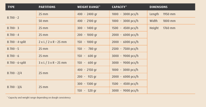 WP700 je průmyslová dělička těsta určená pro přesné dělení širokého spektra těst při výrobě chlebů, housek, baget i pizzy. Stroj zvládá jak tuhá, tak velmi měkká těsta a je navržen pro vysoký výkon až kolem 9 000 kusů za hodinu. Díky variabilní konfiguraci (počet komor/​pocketů) umožňuje výrobu různých typů výrobků v širokém hmotnostním rozsahu.