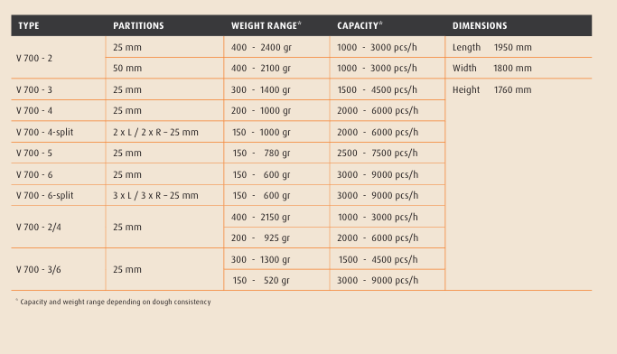 WP700 je průmyslová dělička těsta určená pro přesné a šetrné dělení širokého spektra těst při výrobě chlebů, housek, baget i pizzy. Stroj zvládá jak tuhá, tak velmi měkká a hydratovaná těsta (včetně francouzských“) a dosahuje výkonu až kolem 9 000 kusů za hodinu. Díky variabilnímu počtu komor (pocketů) umožňuje flexibilní výrobu různých typů výrobků v širokém hmotnostním rozsahu.