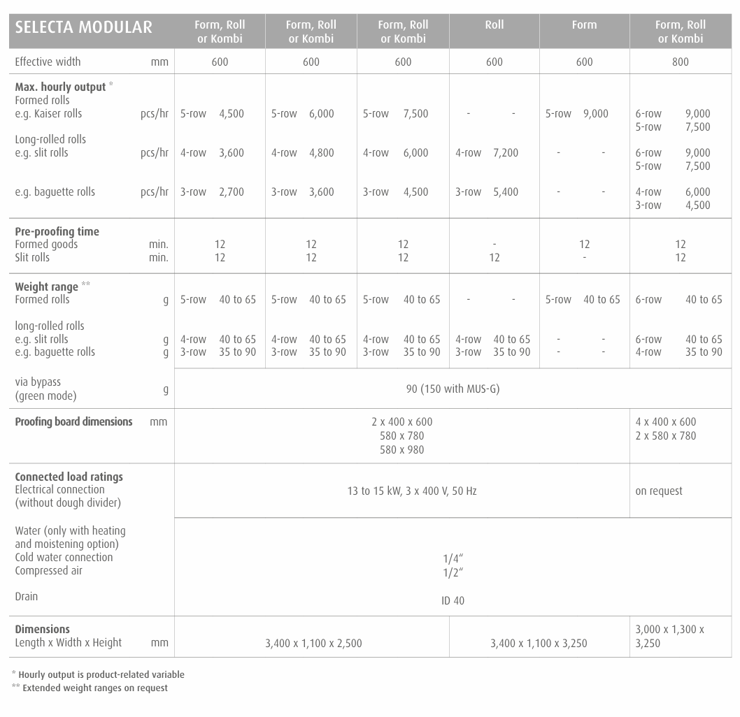 WP SELECTA MODULAR je modulární linka na výrobu pečiva určená pro řemeslné i střední pekárny, které požadují vysokou flexibilitu výroby. Linka umožňuje produkci širokého spektra výrobků – od kulatých a ražených housek (Kaiser, hvězda, Wachauer) až po podlouhlé výrobky jako bagetky, rohlíky nebo krusty. Díky modulární koncepci lze linku přesně přizpůsobit aktuálnímu sortimentu a postupně ji rozšiřovat podle potřeb provozu.
