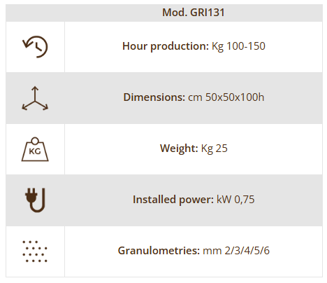 Stroj je vybaven jedním mlecím systémem a výměnnými síty, které umožňují volit velikost výsledné frakce. Bezpečnostní kryt uvnitř zásobníku chrání obsluhu během provozu a zajišťuje bezpečné používání zařízení.