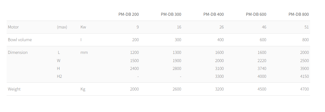 Oproti řadě PM D je stroj řešen v mostové konstrukci, kdy se mísa zasouvá pod stroj a následně se automaticky zvedá do pracovní pozice. Toto řešení umožňuje práci s velkými objemy (cca 200–800 l) a zvyšuje ergonomii i efektivitu manipulace.