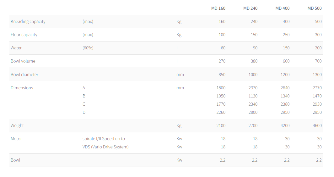 Escher MD Line je průmyslový spirálový hnětač s výsypem těsta spodní částí mísy, určený pro velké pekárenské provozy a automatizované výrobní linky. Po dokončení hnětení je těsto vypuštěno přímo na dopravník nebo do mobilní nádoby a může plynule pokračovat do děličky nebo dalšího technologického kroku. Tento systém je vhodný pro výrobu velkých dávek těst na chleby, housky, bagety nebo další kynuté výrobky v nepřetržitém provozu.