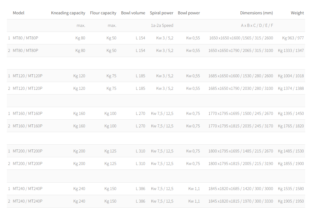 Escher MT Line je spirálový hnětač s pevnou mísou vybavený hydraulickým zvedacím a výklopným systémem pro vykládání těsta. Po ukončení hnětení může být mísa hydraulicky nakloněna a těsto je automaticky vyloženo přímo do děličky nebo na pracovní stůl. Tento systém je určen pro pekárny s vyšší výrobní kapacitou, kde je potřeba rychlá manipulace s těstem při výrobě chlebů, housek, baget nebo dalších kynutých výrobků.